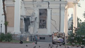 “We Live Here” and “When Lightning Flashes Over the Sea” confront collective grief after the destruction of entire regions, each tied to different incarnations of the Russian state. The former examines a Kazakh region devastated by Soviet nuclear testing, its population and landscape scarred for generations. The latter offers a poetic and warm but post-apocalyptic portrait of Odesa in the wake of Russia’s invasion of Ukraine.